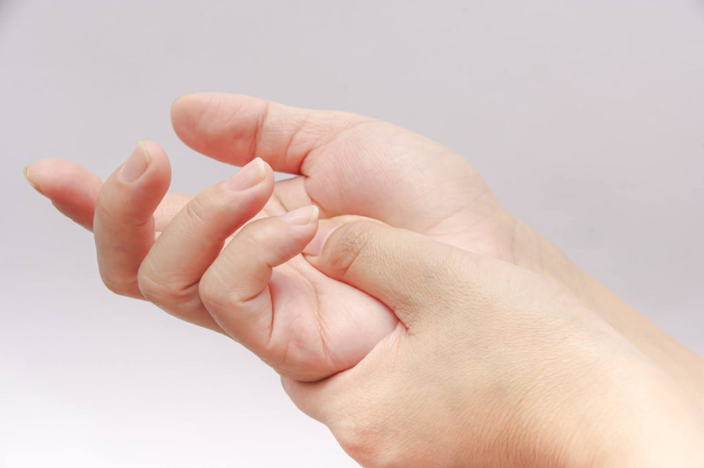 指の付け根(手のひら側)に痛みや腫れが出ることがあります。物をつかむ動作や、指を動かすと痛みが強くなります。症状が進行すると、じっとしていても痛むことがあると言われています。特に親指・中指・薬指に多いですが、どの指にも起こる可能性あります。